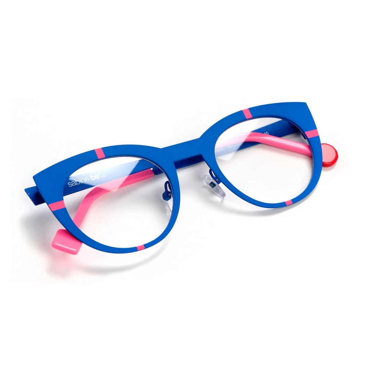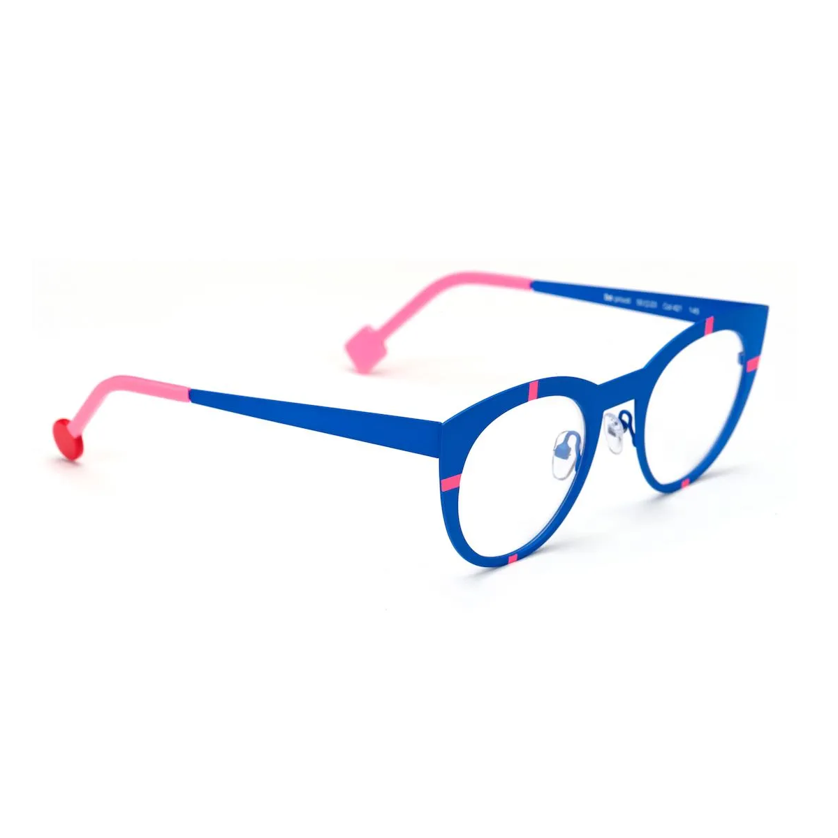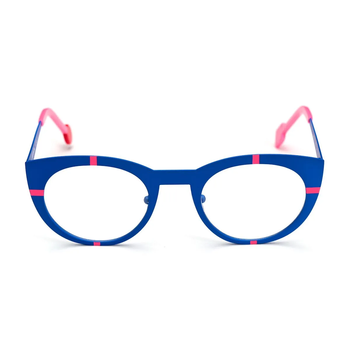 Matte Majorelle blue metal round cat-eye eyeglass frame with fluorescent pink accents and asymmetrical temple tips.