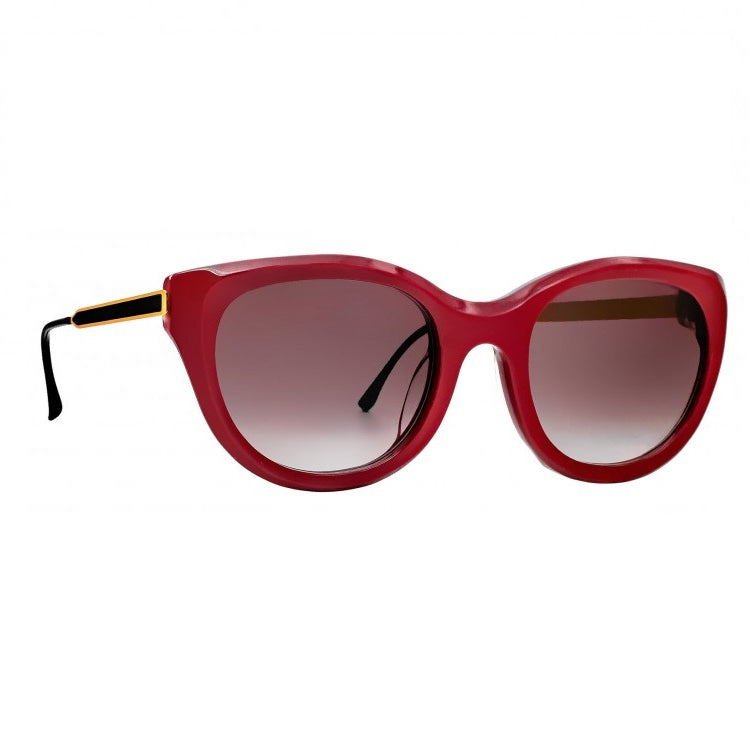 Red cateye acetate sunglass frame with black and gold metal temples and brown gradient tint lenses.