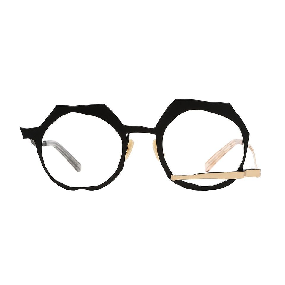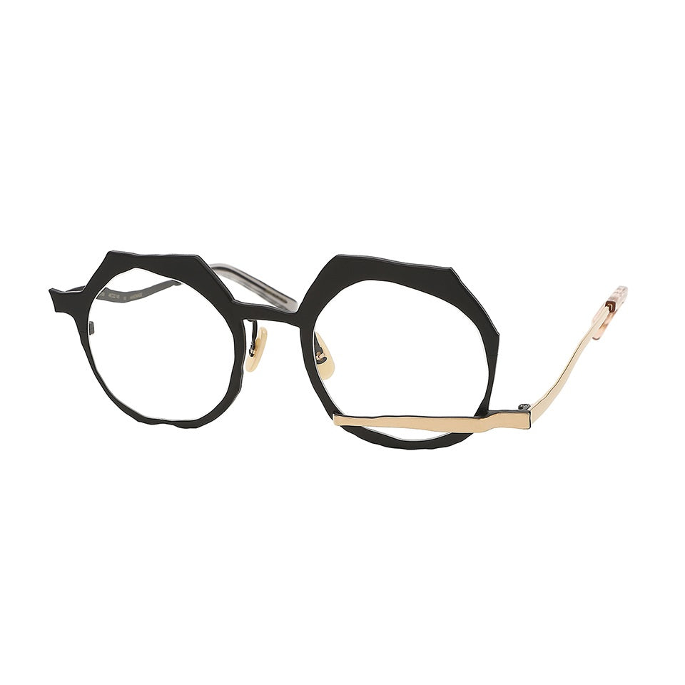 Painted black round asymmetrical titanium eyeglass frame with gold line and drop temple detail. Adjustable nosepads.