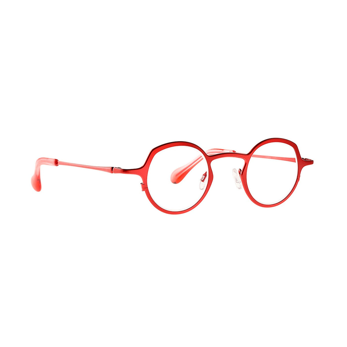 Shiny red metal round eyeglass frame from Theo's liquid elements series.